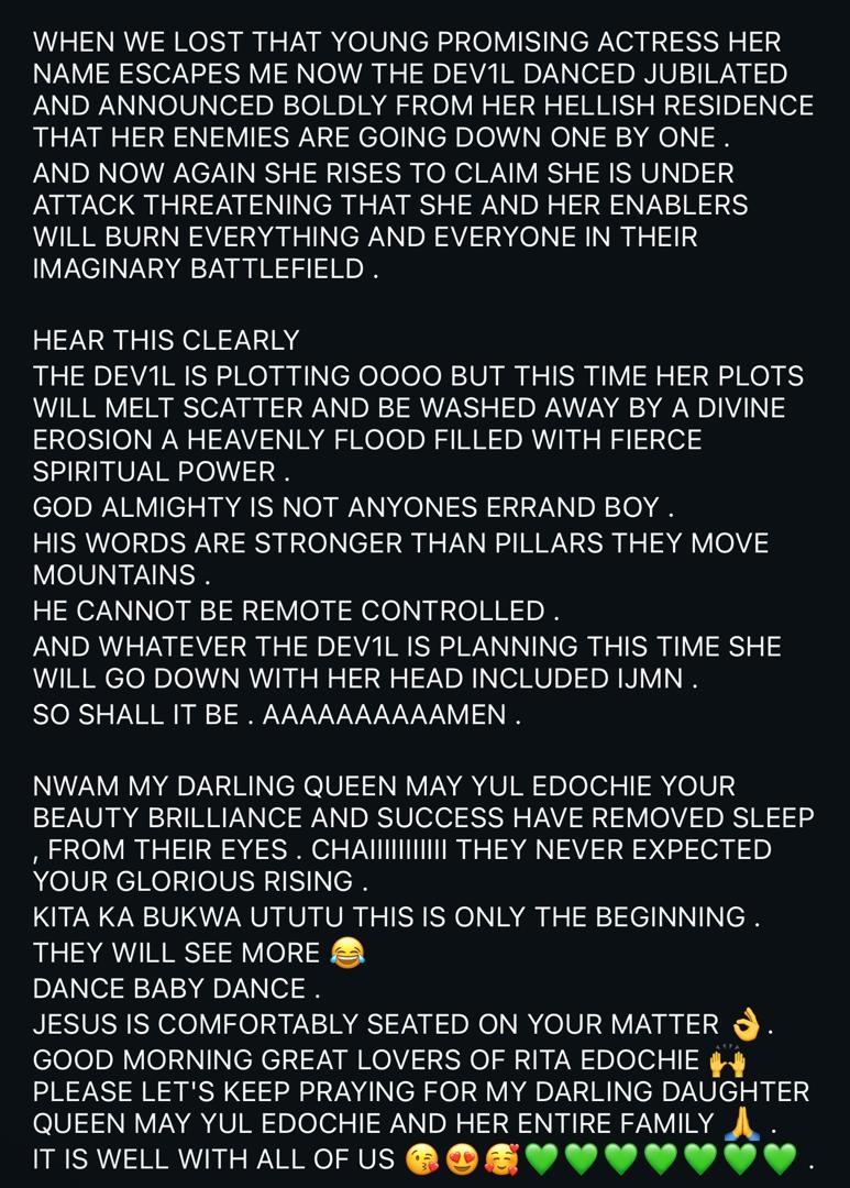 In a new update, Rita Edochie took to Instagram to show strong support for May Yul Edochie, Yul’s first wife, who was married to him before Judy reportedly became pregnant by the actor and he later married her.