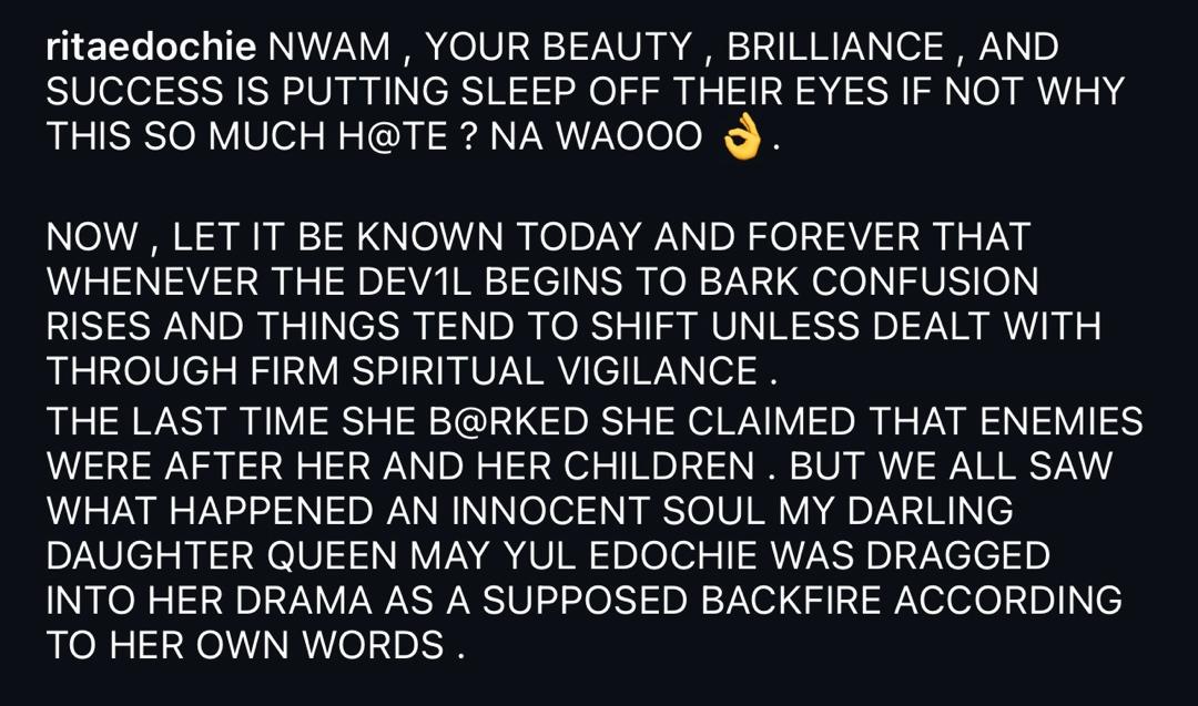Nollywood actress, Rita Edochie has weighed in on the recent claims by Yul Edochie’s estranged wife, Judy Austin, who alleged she was targeted by spiritual attacks.