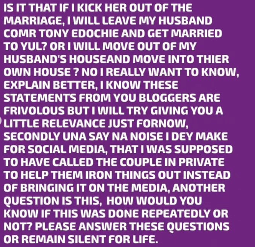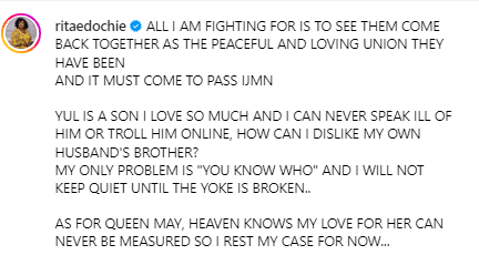 Rita Edochie stated that the reason behind her fight is to see the two come back as husband and wife like they have always been.
