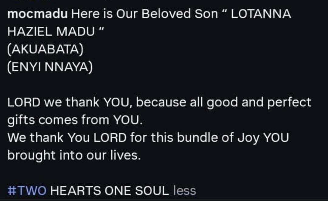 “Here is our beloved son, Lotanna Haziel Madu. Lord, we thank You because all good and perfect gifts come from You. We thank You for this bundle of joy You brought into our lives. Two hearts, one soul,” he wrote.