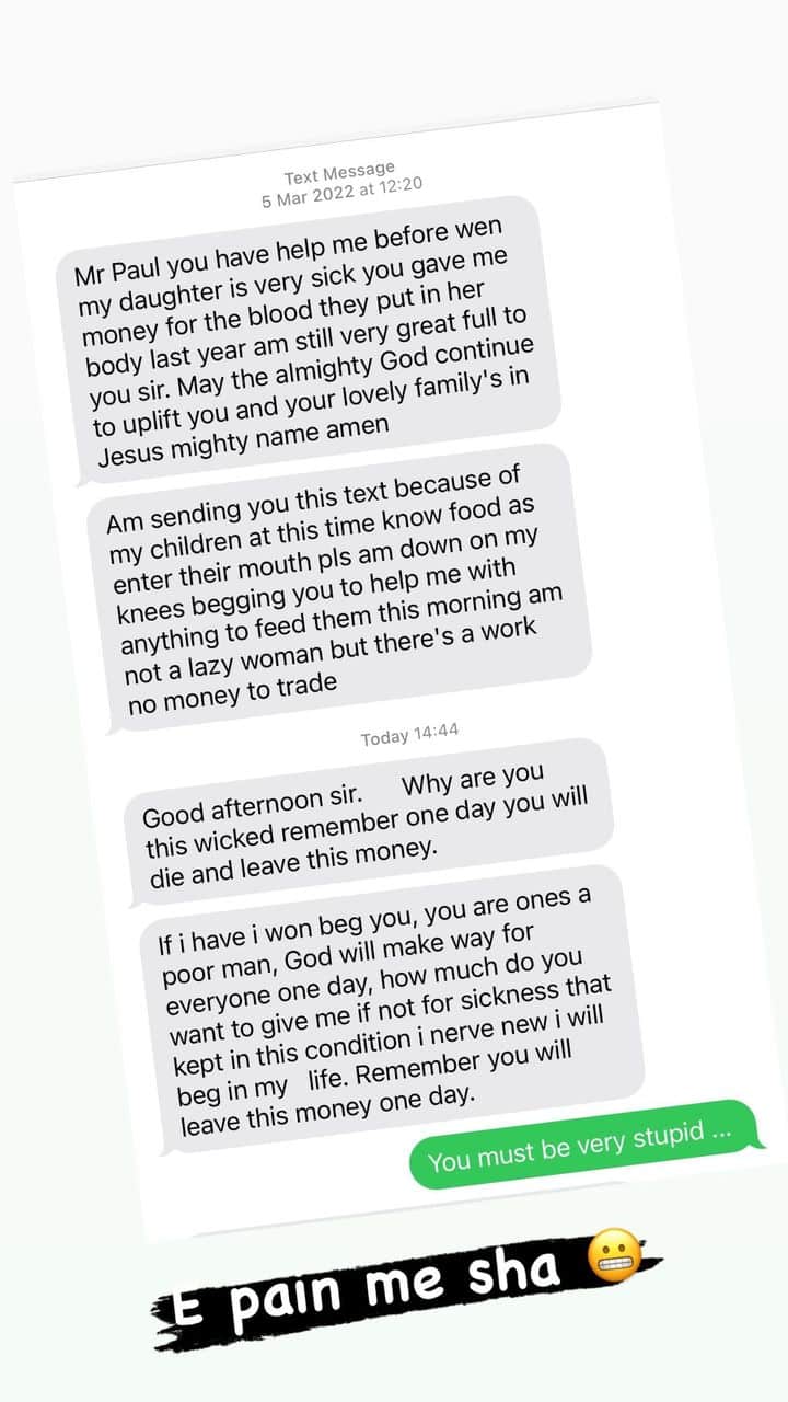 Veteran singer, Paul Okoye, also known as Rudeboy has shared screenshots of his conversation with a woman, who rained insults on him for no longer coming through for her.