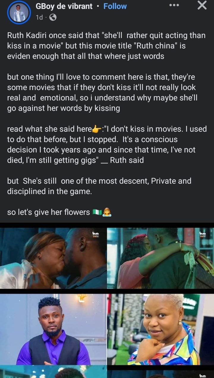 A Facebook user with the handle GBoy de Vibrant has called out actress Ruth Kadiri over her kissing scene in a movie.