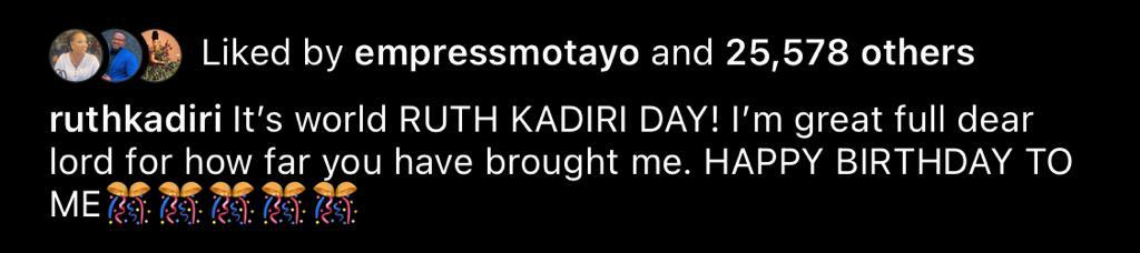 “It’s world RUTH KADIRI DAY! I’m great full dear lord for how far you have brought me. HAPPY BIRTHDAY TO ME🎊🎊🎊🎊🎊”
