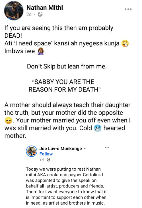 “If you are seeing this then I am probably DEAD! Ati ‘I need space’ kansi ah nyegesa kunja (however, she is sleeping around). Don’t Skip but learn from me. sabby you are the reason for my death,” Mithi wrote.