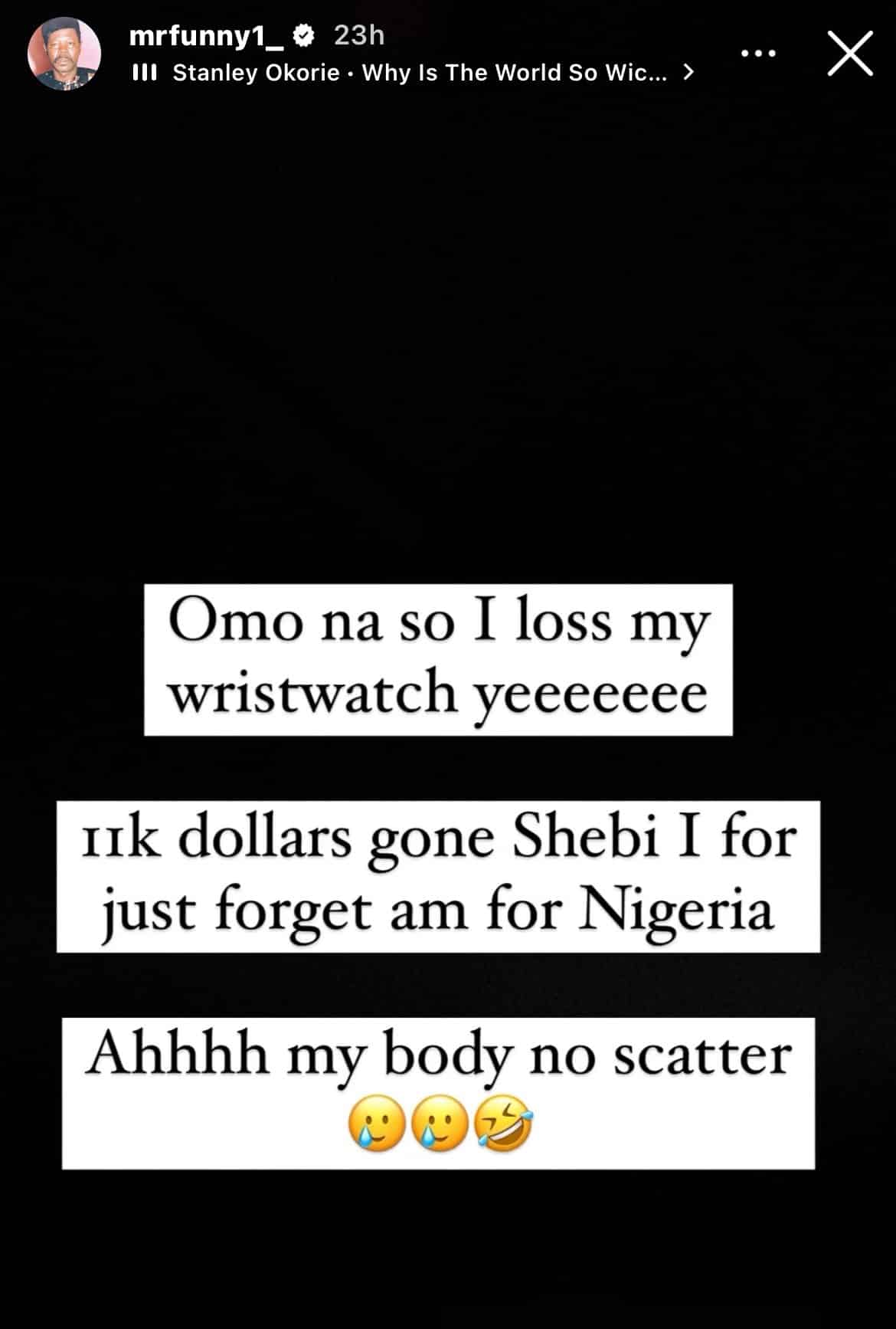 “Omo na so I loss my wristwatch yeeeeeee 11k dollars gone Shebi I for just forget am for Nigeria Ahhbbh my body no scatter”
