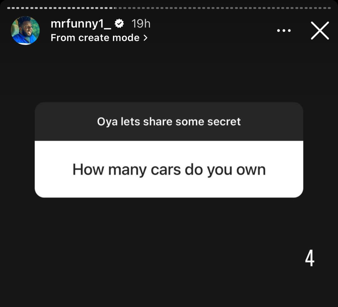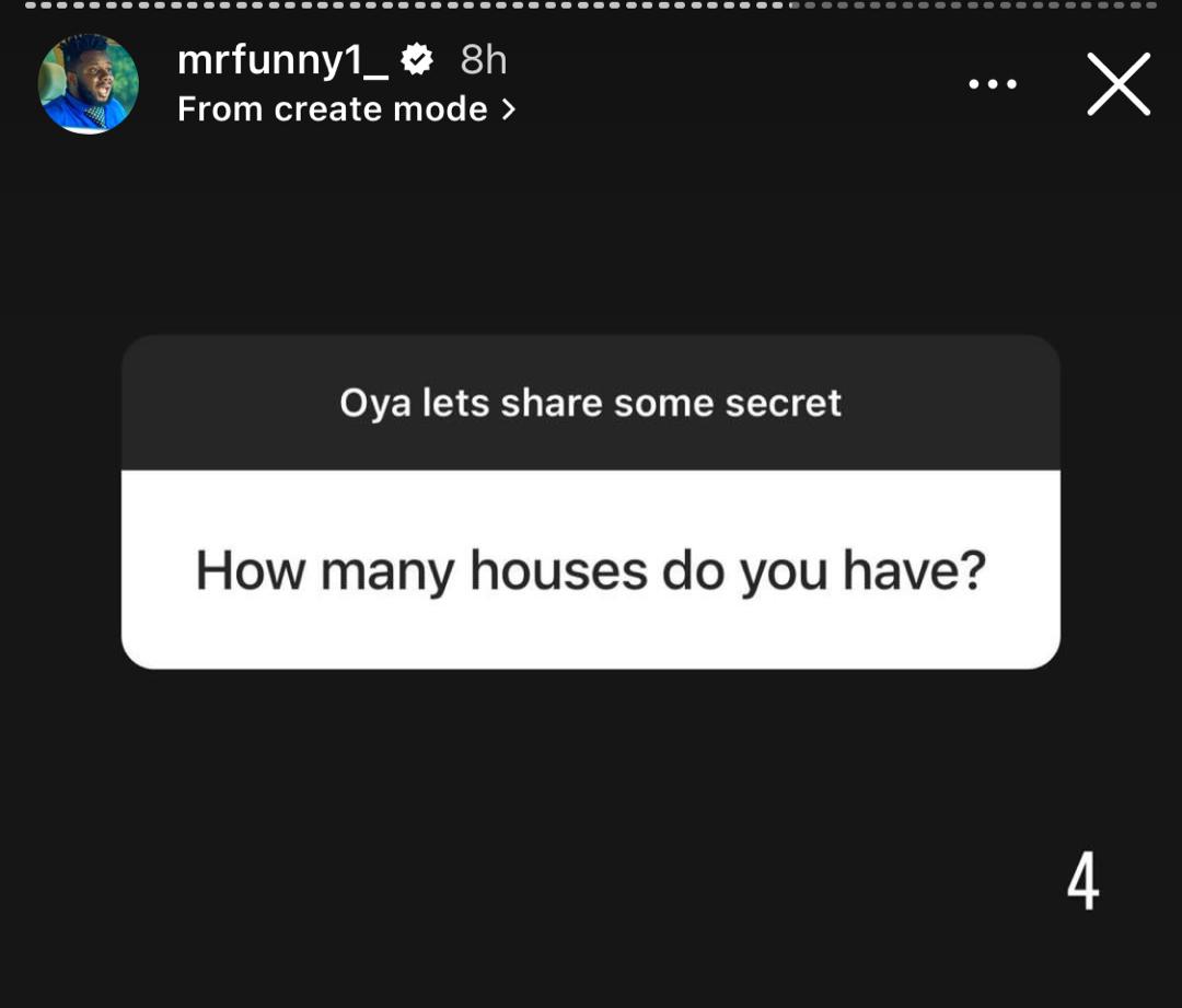 During a question and answer session on Instagram, the comedian who won an award at the 2022 Africa Magic Viewers’ Choice Awards (AMVCA) and many more after that engaged his followers who quested to know more about him.