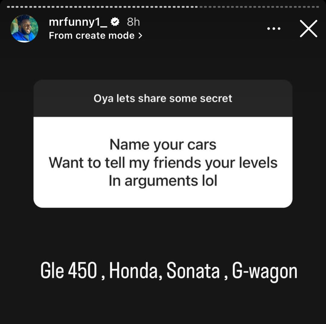 Without mentioning the number of cars in his possession, Sabinus noted the brands he owns instead including Mercedes Benz GLE 450, Honda, Sonata, and G-Wagon.