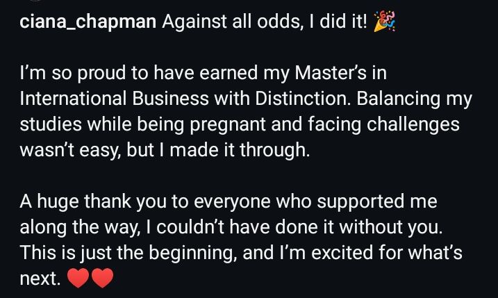 Taking to Instagram, Ciana reflected on the challenges encountered during her educational journey, describing it as challenging.