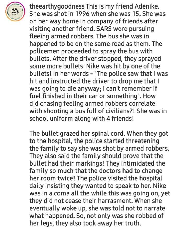 “This is my friend Adenike. She was shot in 1996 when she was 15. She was on her way home in company of friends after visiting another friend. SARS were pursuing fleeing armed robbers. The bus she was in happened to be on the same road as them. The policemen proceeded to spray the bus with bullets.