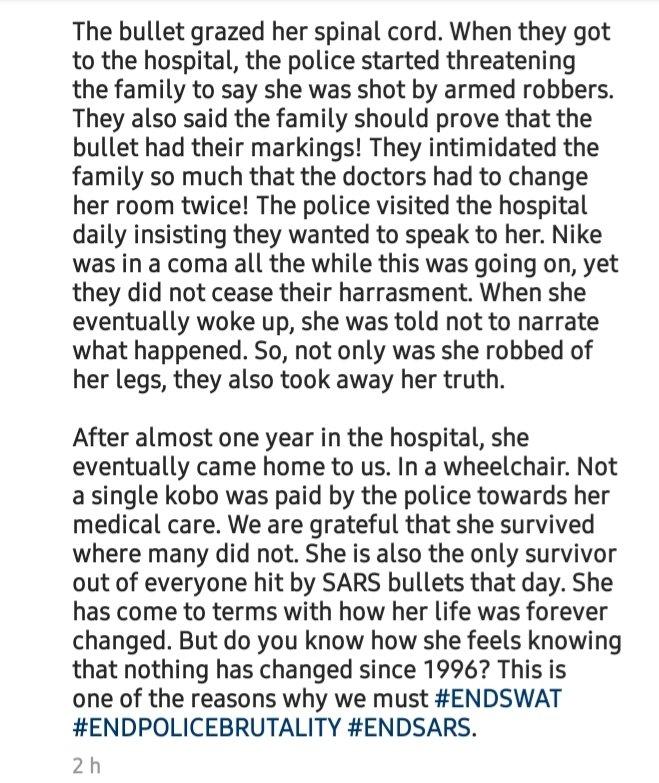 She is also the only survivor out of everyone hit by SARS bullets that day. She has come to terms with how her life was forever changed. But do you know how she feels knowing that nothing has changed since 1996? This is one of the reasons why we must #ENDSWAT #ENDPOLICEBRUTALITY #ENDSARS.”
