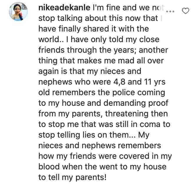 The police visited the hospital daily insisting they wanted to speak to her. Nike was in a coma all the while this was going on, yet they did not cease their harrasment. When she eventually woke up, she was told not to narrate what happened. So, not only was she robbed of her legs, they also took away her truth.