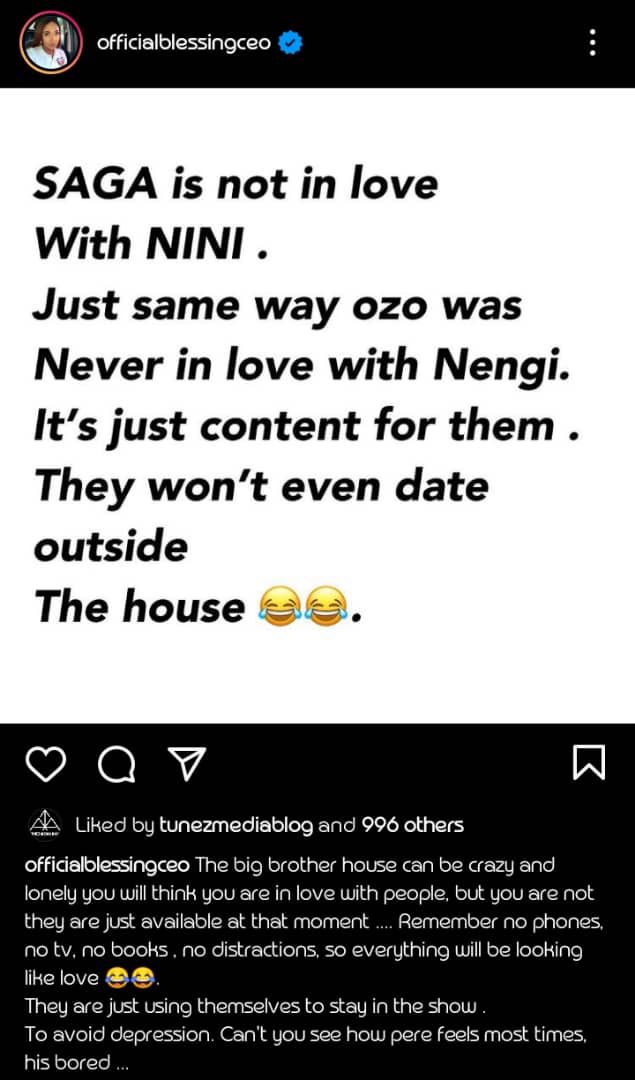Relationship therapist, Blessing Okoro Nkiruka, popularly known as Blessing CEO has affirmed that Saga isn’t in love with Nini, rather it’s just the content Nigerians signed up for.