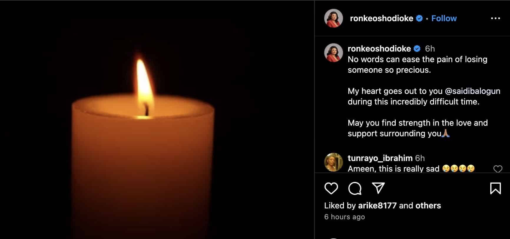 “No words can ease the pain of losing someone so precious. My heart goes out to you @saidibalogun during this incredibly difficult time. May you find strength in the love and support surrounding you,” she wrote.