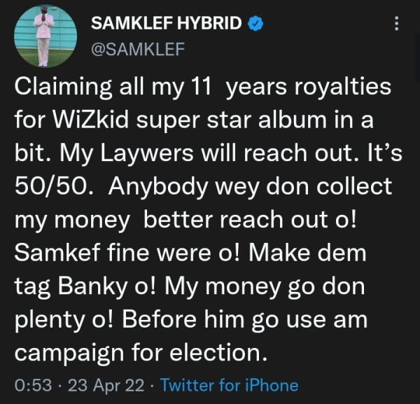 “Claiming all my 11 years royalties for WiZkid super star album in a bit. My Laywers will reach out. It’s 50/50. Anybody wey don collect my money better reach out o! Samkef fine were o! Make dem tag Banky o! My money go don plenty o! Before him go use am campaign for election.”
