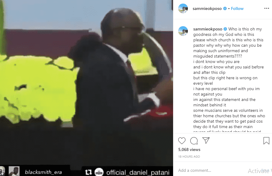 Reacting to the comment, Sammie Okposo stated that it is wrong on all levels. The gospel singer who noted that some instrumentalists serve as volunteers in their home churches, stated that the ones who opt to get paid for playing church instruments on full time basis, do so as their main source of livelihood should be paid. Sammie Okposo also wondered who ordained the UK-based preacher.
