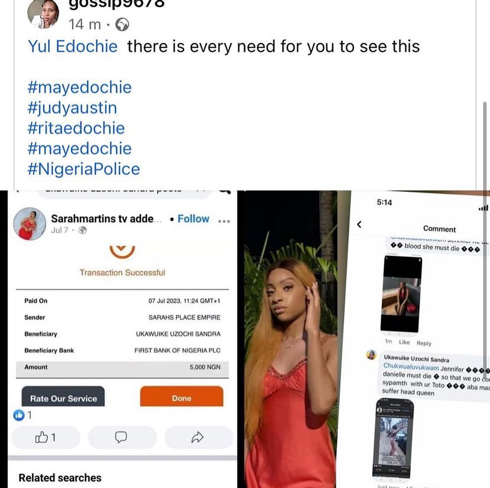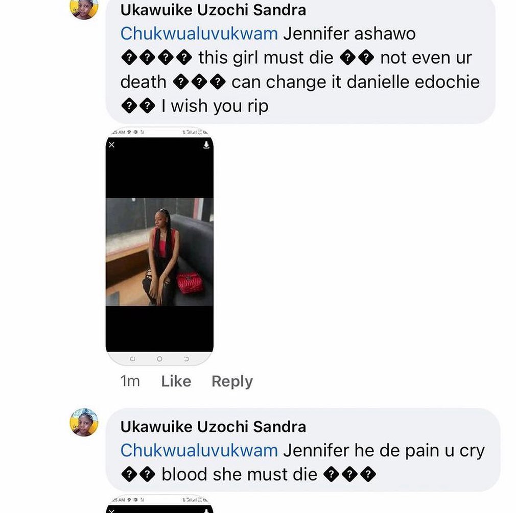 In the post sighted on Facebook, the troll who was paid N5000 by Sarah Martins has been seen in the comment section posting the photo of Daniell Edochie, the daughter of Yul and May Eodchie, and wishing her death.