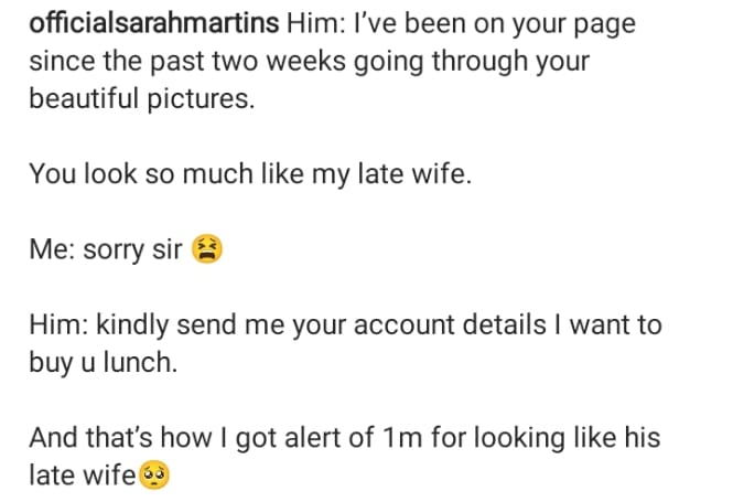 On the photo of the alert she shared, Sarah Martins wrote: “When a random man sends you 1m for looking like his late wife.”