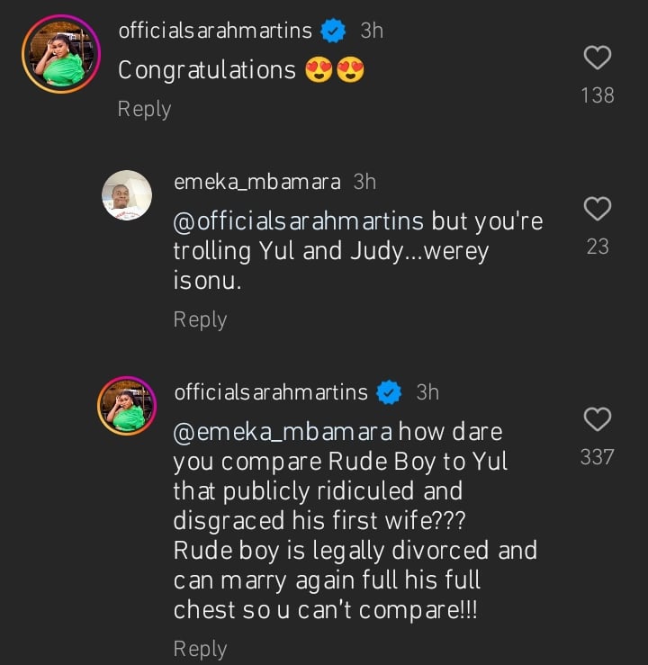 Sarah Martins slams netizen criticizing her for supporting Paul Okoye’s remarriage but trolling Yul Edochie