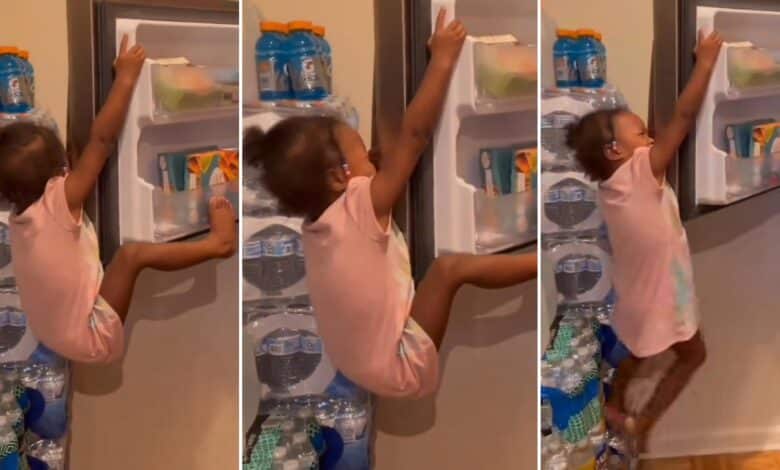 Scary moment a little girl climbed fridge to steal snacks and got stuck (Video)