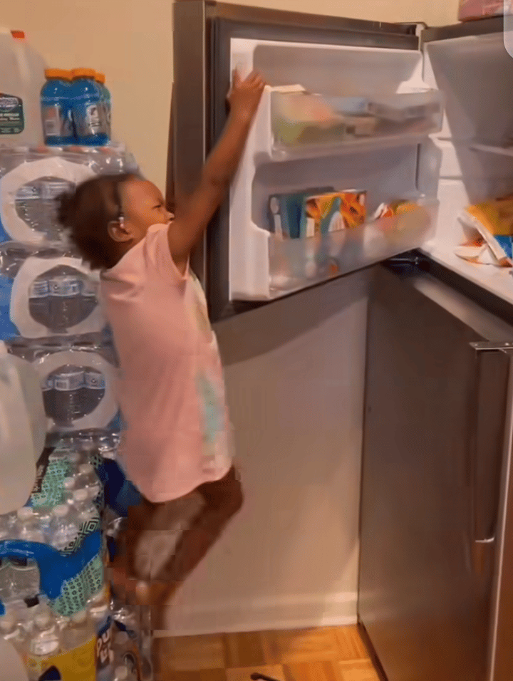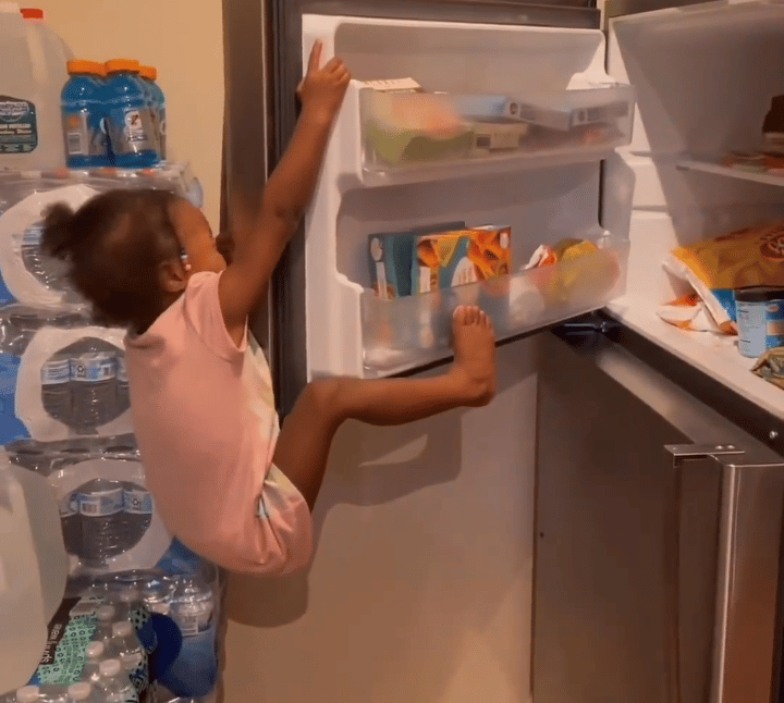 In the video, the toddler was seen hanging on the door of the top fridge after a failed attempt to steal cookies from it.