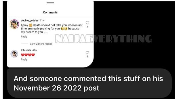 While sharing her dream on Instagram, she prayed fervently for the singer that death doesn’t end his life when it is not yet time.
