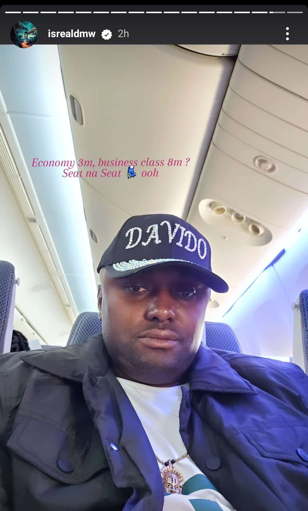 Davido’s logistics manager, Israel Afeare, popularly known as Isreal DMW, has shared details of his journey to the United Kingdom on his Instagram page as he travels in economy class.