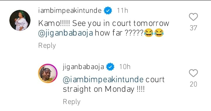 She commented, “Kamo!!! See you in court tomorrow @jiganbabaoja how far??”.
