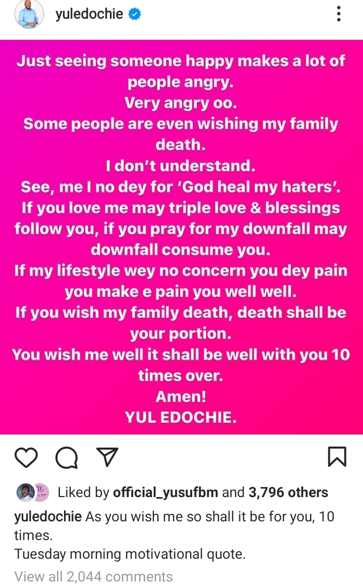 “Seeing someone happy makes a lot of people very angry” – Yul Edochie blows hot, lays curses on those wishing him death