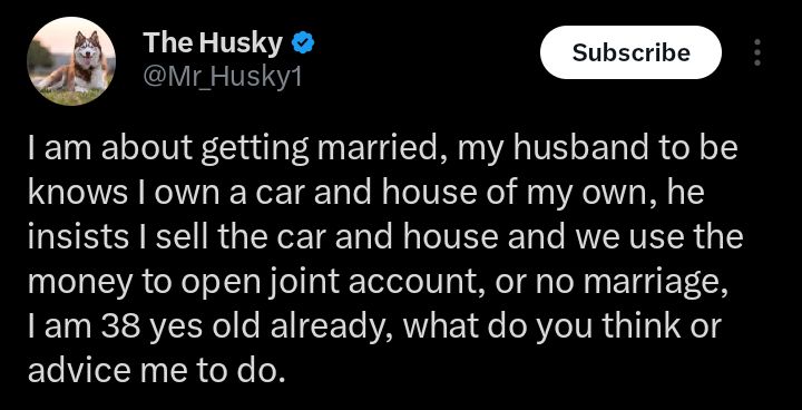 According to her, the man wants the proceeds from the sale to be placed into a joint account as a condition for marriage. “He insists I sell the car and house and we use the money to open a joint account, or no marriage,” she said.