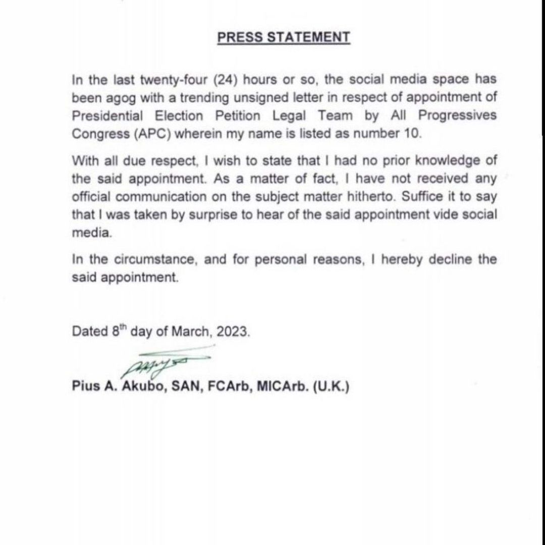Senior Advocate of Nigeria (SAN) Pius Akubo has rejected the appointment to be part of the legal team to defend President-elect Tinubu in court.