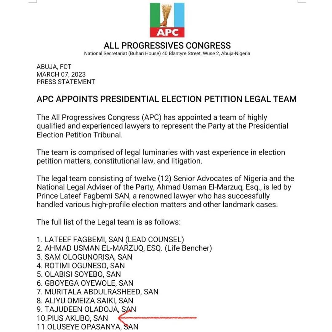 “In the last twenty-four (24) hours or so, the social media space has been agog with a trending unsigned letter in respect of appointment of Presidential Election Petition Legal Team by All Progressives Congress (APC) wherein my name is listed as number 10,” said the senior lawyer in a statement.