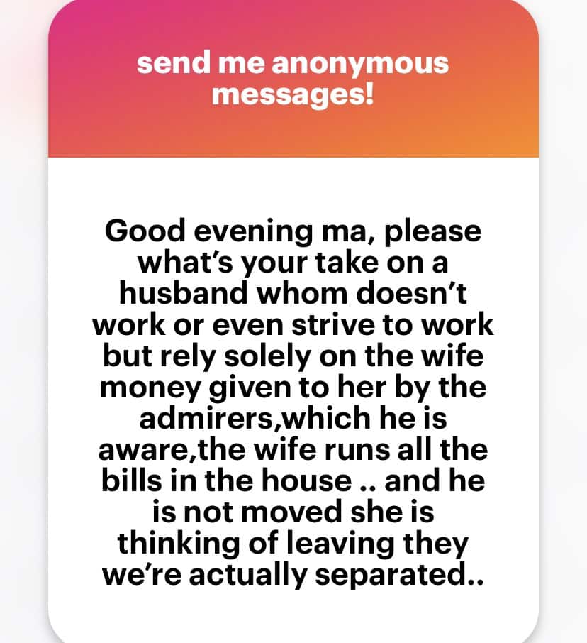 “Good evening ma, please what’s your take ona husband whom doesn’t work or even strive to work but rely solely on the wife money given to her by the admirers,which he is aware,the wife runs all the bills in the house .. and he is not moved she is thinking of leaving they we’re actually separated..”
