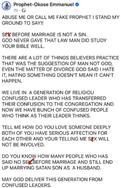 In his post, Prophet Okose argues that there is no divine law explicitly prohibiting premarital sex.