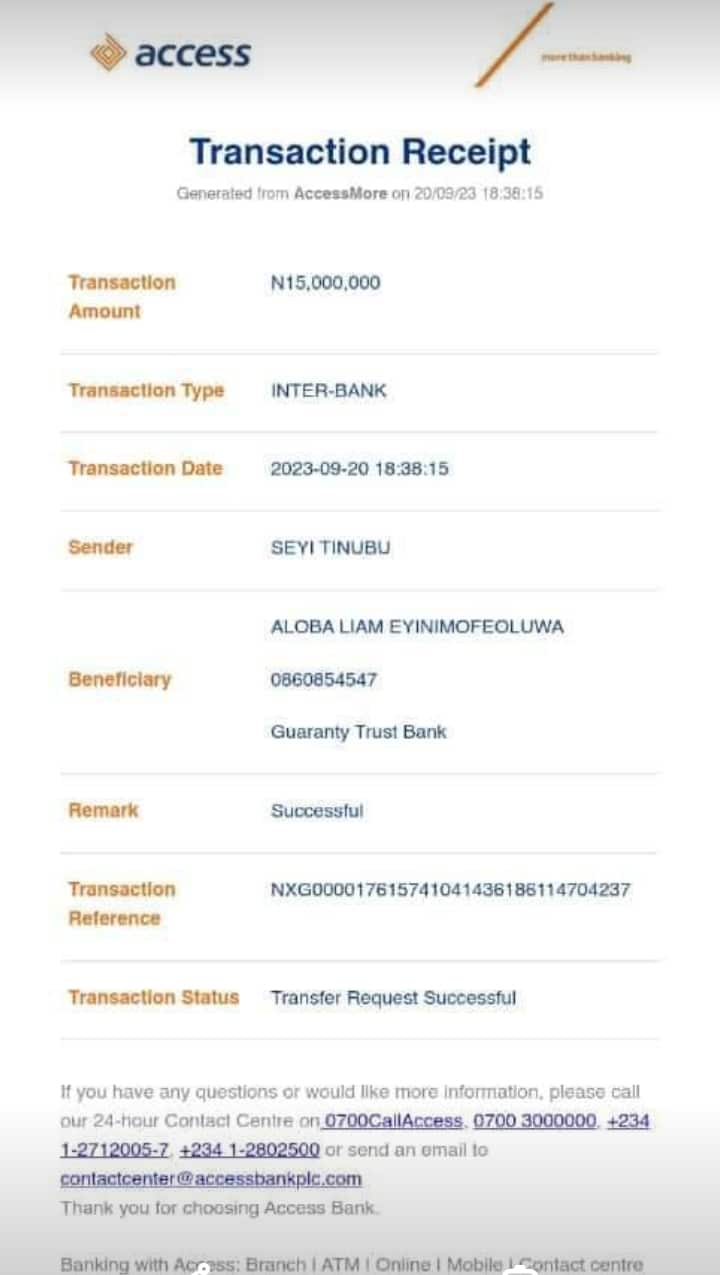 Screenshot of the transaction making the rounds online showed that Seyi Tinubu sent Mohbad’s son 15 million naira.