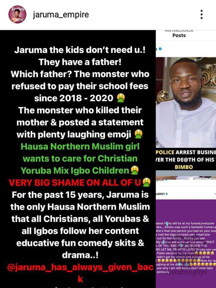“Jaruma the kids don’t need u.! They have a father! Which father? The monster who refuse to pay their school fees since 2018-2020🤮