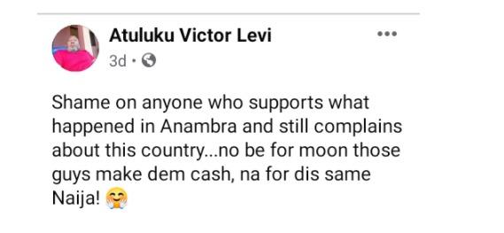 “Shame on anyone who supports what happened in Anambra and still complains about this country…no be for moon those guys make dem cash, na for dis same Naija!”