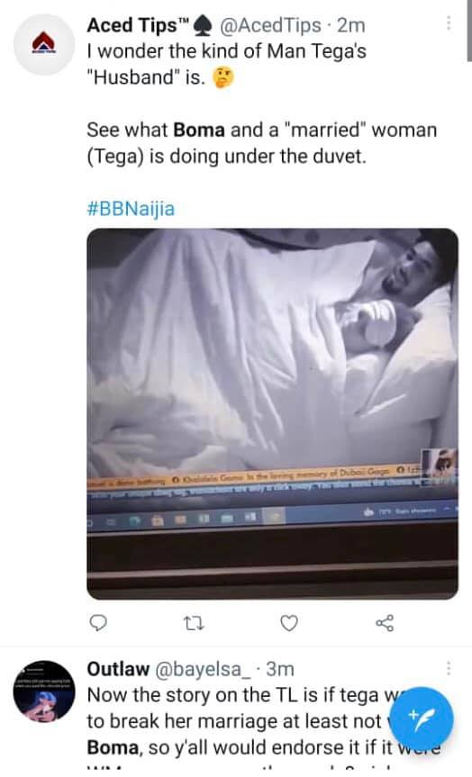 According to viewers, Tega should be ‘shameful’ for engaging in such activities because of her status as a legally married woman whose husband is at watching the same show.
