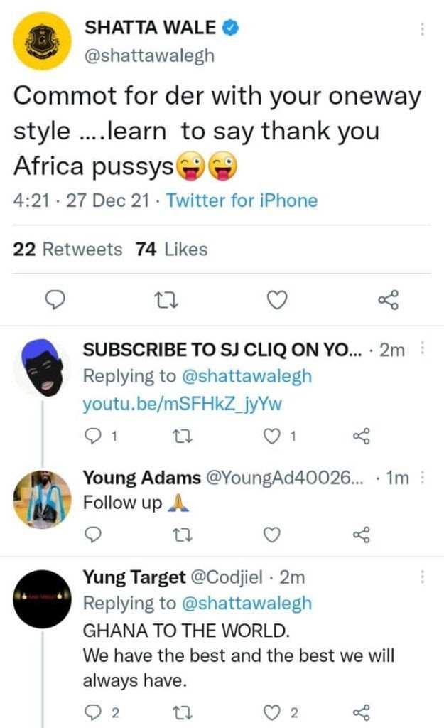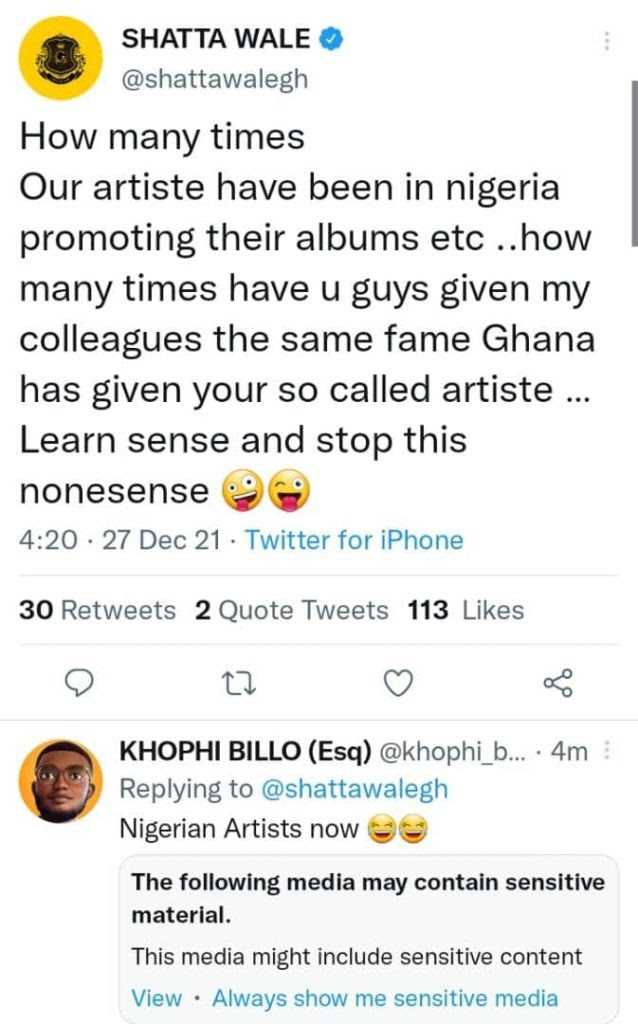 Ghanaian dancehall singer, Shatta Wale, fires back following the backlash that trailed his comment on the zero impact of Nigerian singers in their music industry.