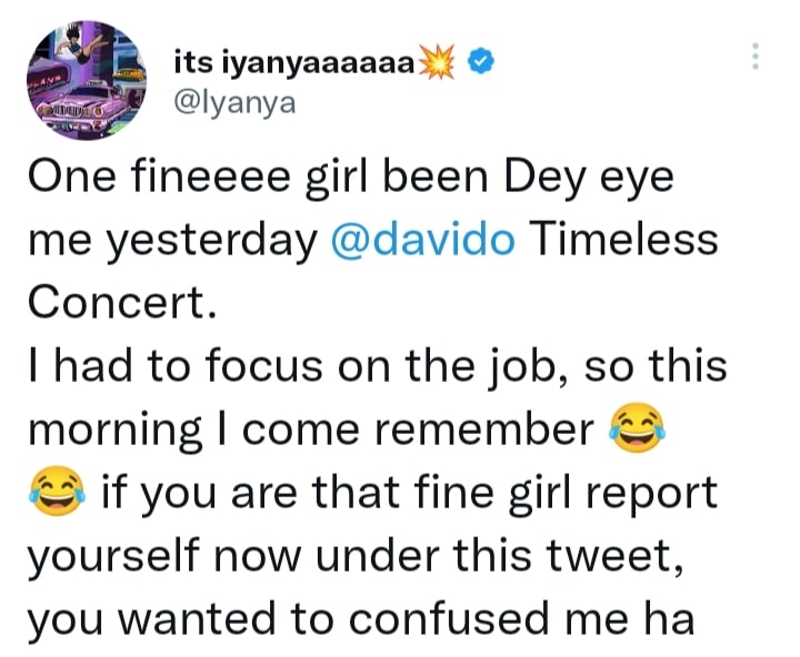 “One fineeee girl been Dey eye me @davido Timeless Concert. I had to focus on the job, so this morning I come remember if you are that fine girl report yourself now under this tweet, you wanted to confused me ha”, he wrote.