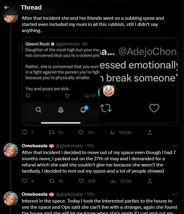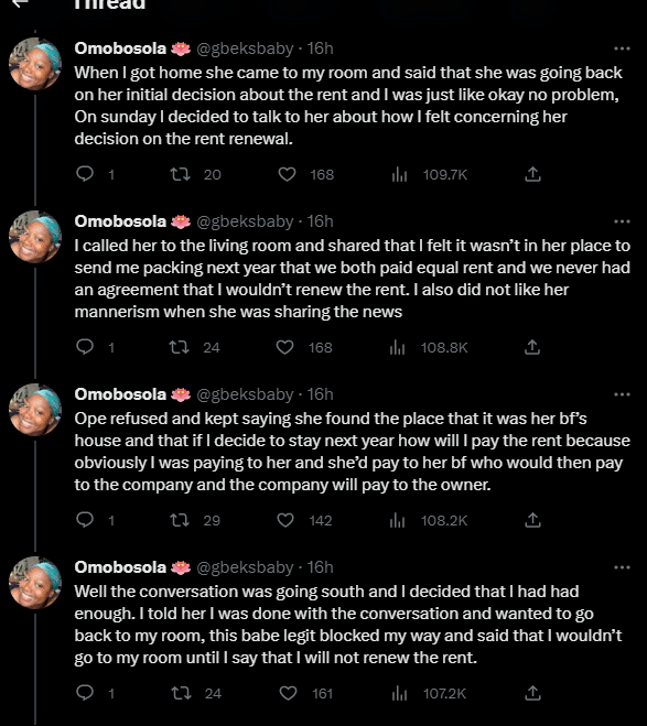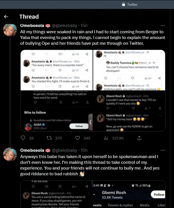 “All my things were soaked in rain and I had to start coming from Berger to Yaba that evening to pack my things. I cannot begin to explain the amount of bullying Ope and her friends have put me through on Twitter.”
