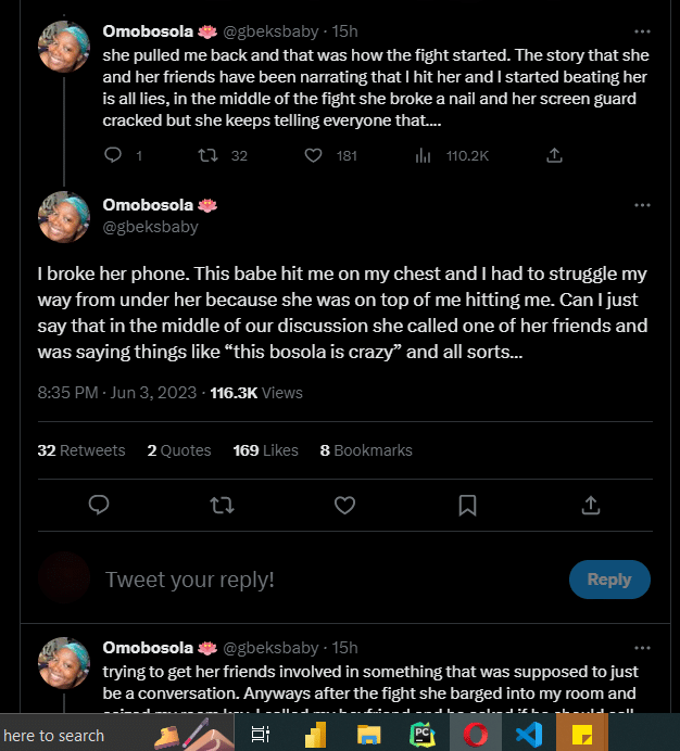 “She pulled me back and that was how the fight started. The story that she and her friends have been narrating that I hit her and I started beating her is all lies, in the middle of the fight she broke a nail and her screen guard cracked but she keeps telling everyone that I broke her phone.
