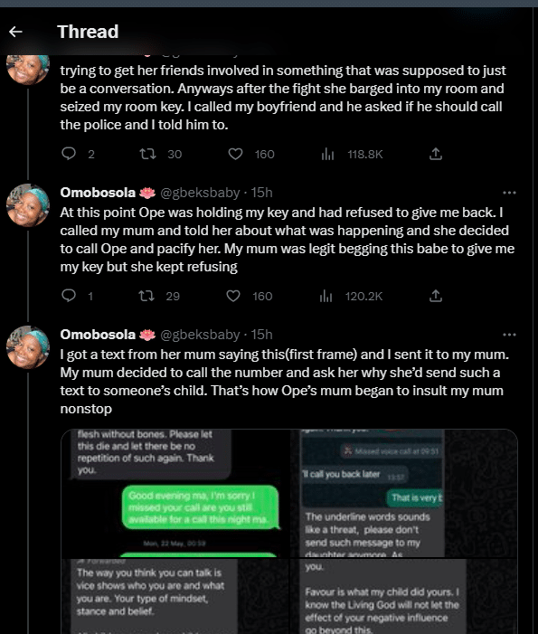 “I got a text from her mum saying this(first frame) and I sent it to my mum. My mum decided to call the number and ask her why she’d send such a text to someone’s child. That’s how Ope’s mum began to insult my mum nonstop.