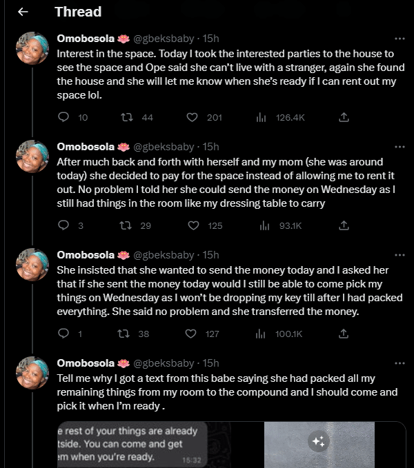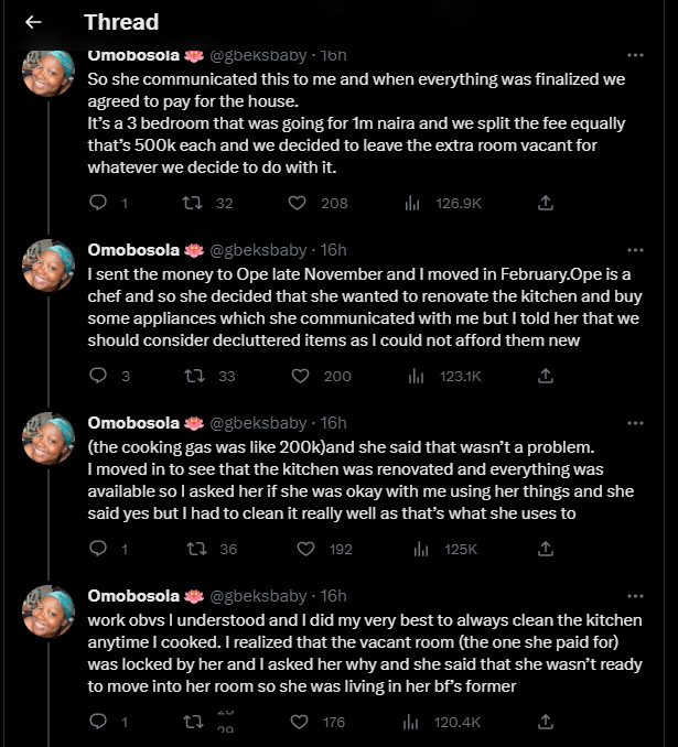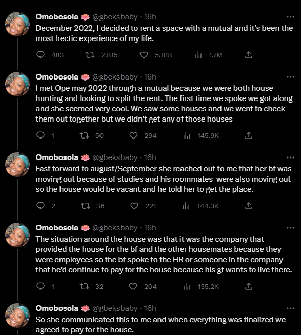 “December 2022, I decided to rent a space with a mutual and it’s been the most hectic experience of my life. I met Ope may 2022 through a mutual because we were both house hunting and looking to split the rent. The first time we spoke we got along and she seemed very cool. We saw some houses and we went to check them out together but we didn’t get any of those houses.