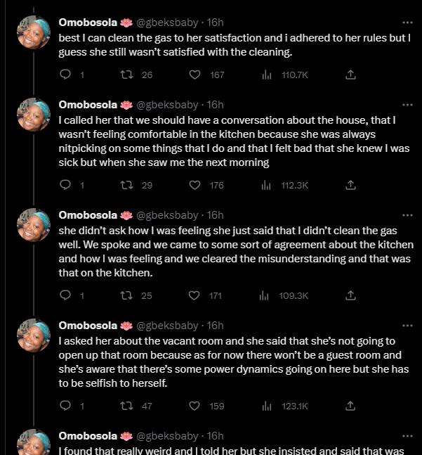“I let it go because obvs she didn’t have the money to renovate the room and move in so I let it go. She called me one day to complain about the gas cooker and how it was oily after I cooked so I apologized for that and asked her how best I can clean the gas to her satisfaction and i adhered to her rules but I guess she still wasn’t satisfied with the cleaning.