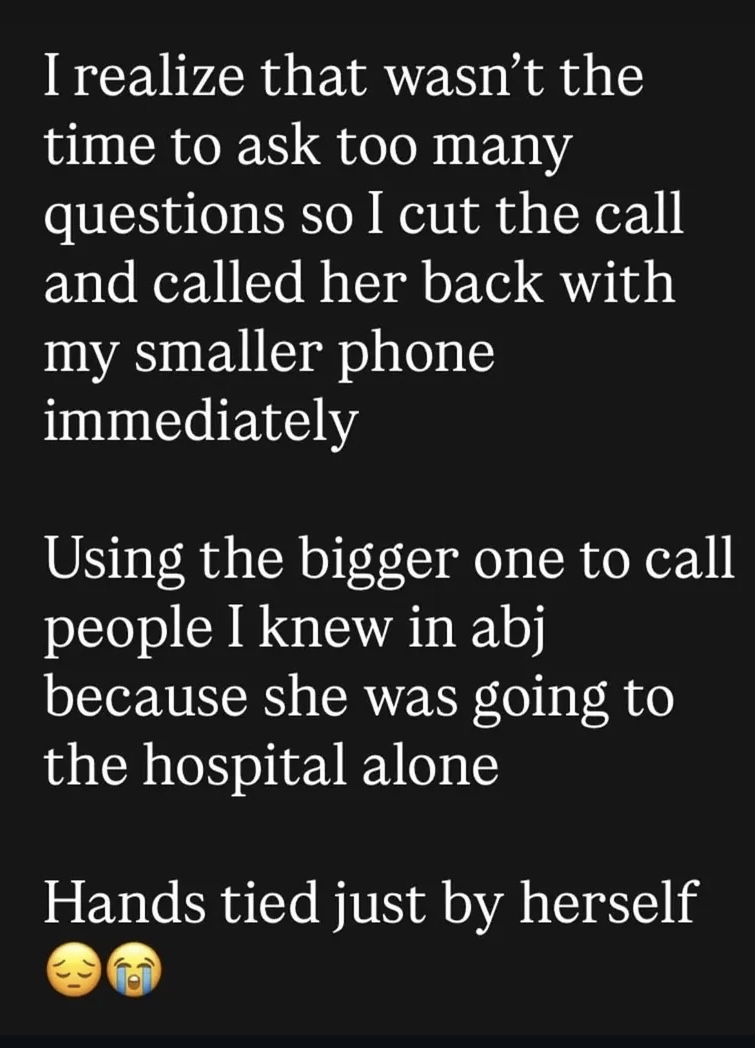I realised that wasn’t the time to ask too many questions, so I cut the call and called her back immediately with my smaller phone, using the bigger one to call people I knew in Abuja because she was going to the hospital alone.