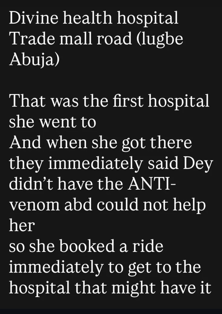 According to Kingsley, Nanyah first went to Divine Health Hospital in Lugbe, Abuja. However, she was told that the hospital did not have anti-venom.