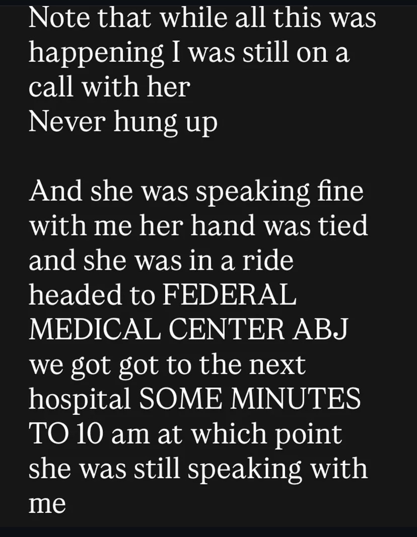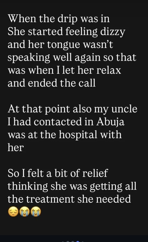 At that point, my uncle I had contacted in Abuja was already at the hospital with her, so I felt a bit of relief, thinking she was getting all the treatment she needed.