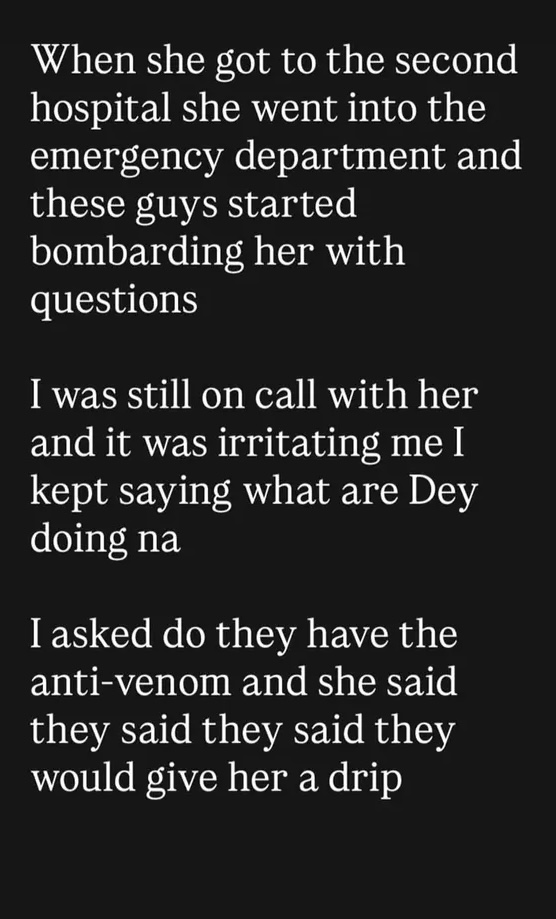 When she got there, they immediately said they didn’t have the anti-venom and could not help her, so she booked another ride immediately to get to a hospital that might have it.