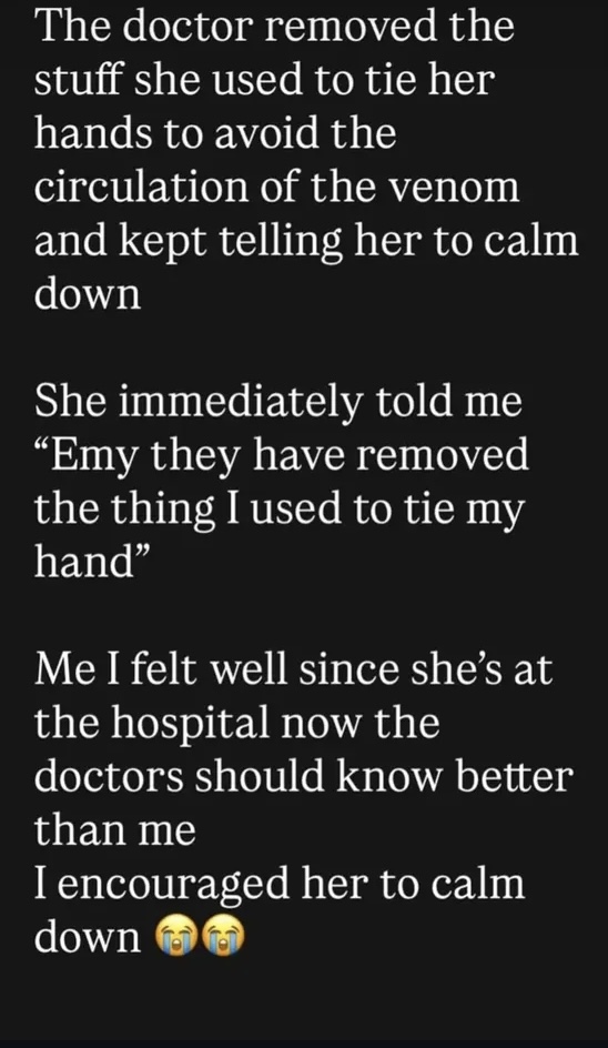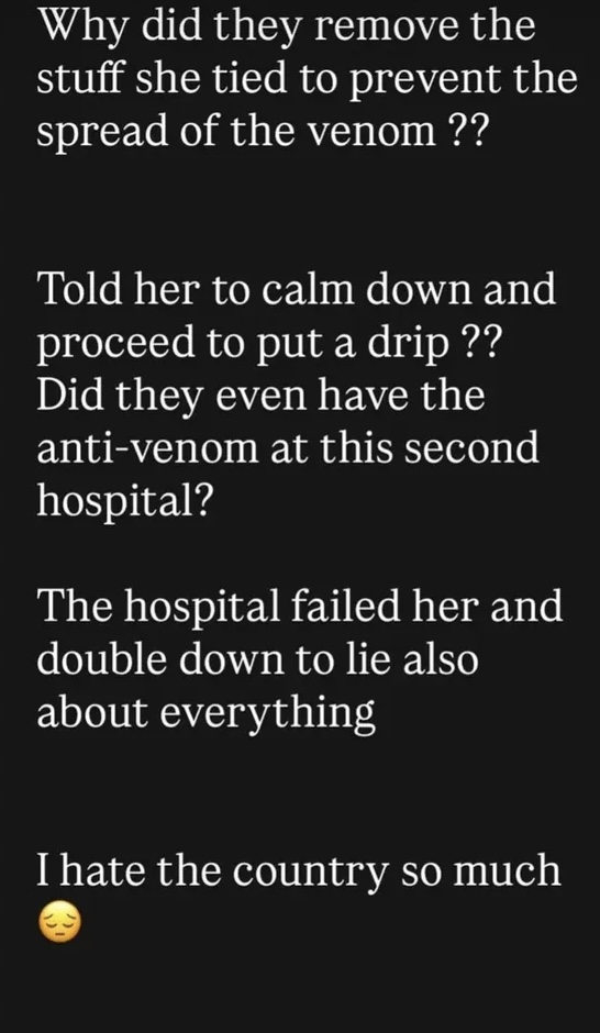 At FMC, Nanyah was taken to the emergency unit, but instead of administering anti-venom immediately, medical staff reportedly asked her several questions. Doctors later removed the cloth tied around her hand and placed her on a drip, asking her to stay calm.