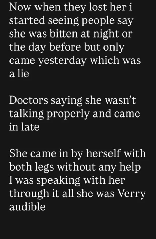 Now, when they lost her, I started seeing people saying she was bitten at night or the day before but only came yesterday — which was a lie.